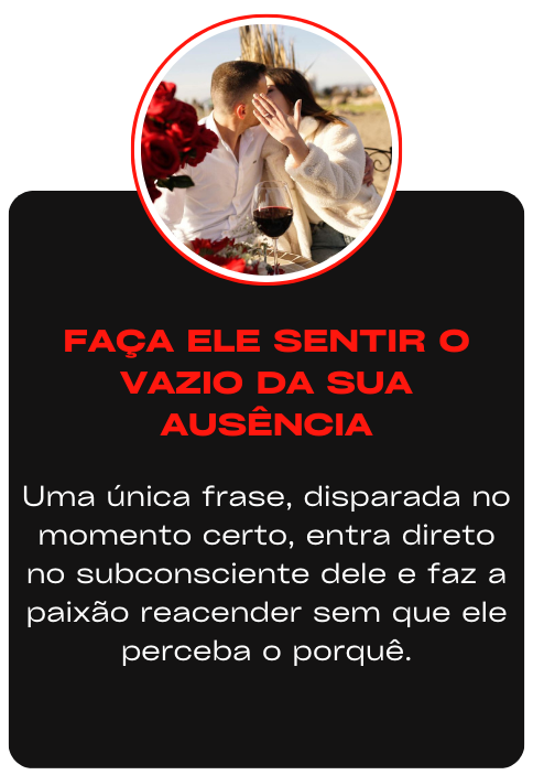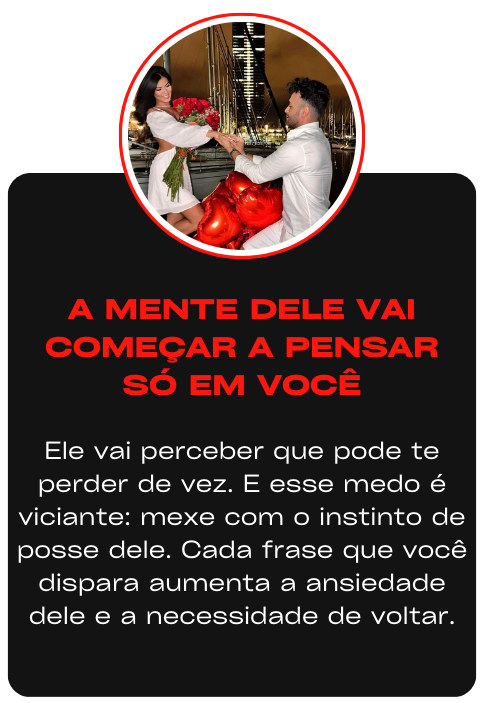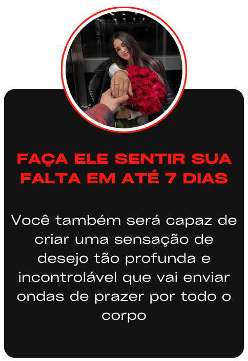Esse método secreto foi criado com apenas uma missão: ser uma arma psicológica de atração, capaz de ativar, no cérebro masculino, os gatilhos emocionais que fazem ele SUAR de saudadeEXPLODIR de desejo… e IMPLORAR pra voltar pros seus braços, como se fosse a única escolha possível.